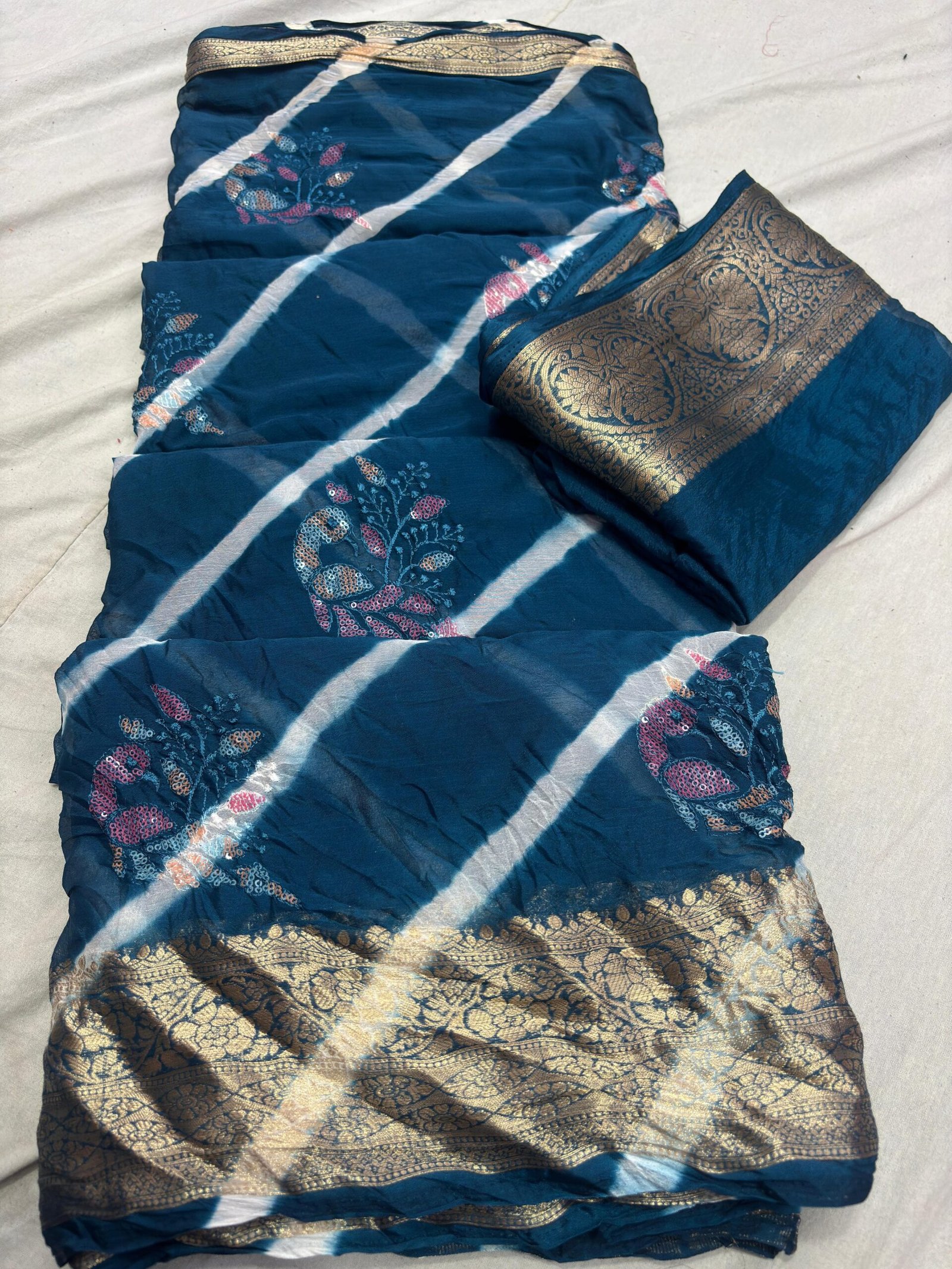 Step into elegance with our beautifully crafted Chinon Fabric Saree, designed to capture eyes with its unique style and softness. It features delicate Resham and Sequin work, highlighted by a trendy new colour-matching Lahriya pattern. The charming flower butta design adds a graceful touch, making it perfect for festive moments or special gatherings. It comes with a matching running blouse in the same fabric, completing the look with effortless style.