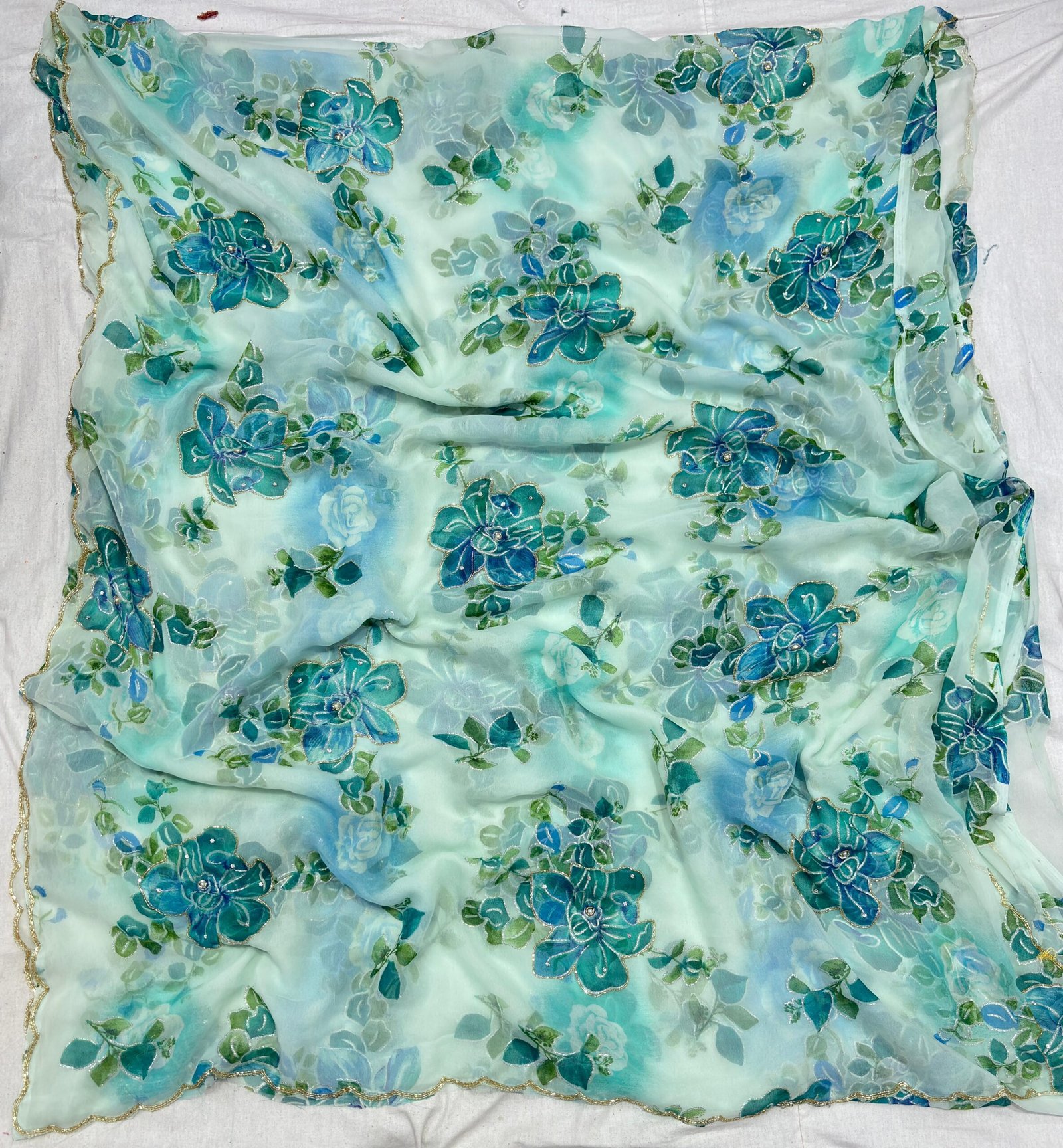 Crafted from lightweight Sifone 30-30 fabric, this saree showcases a charming meel flower print that brings a soft, elegant vibe. Enhanced with delicate handwork on the border and pallu, it’s a beautiful blend of comfort and traditional craftsmanship perfect for any graceful occasion.