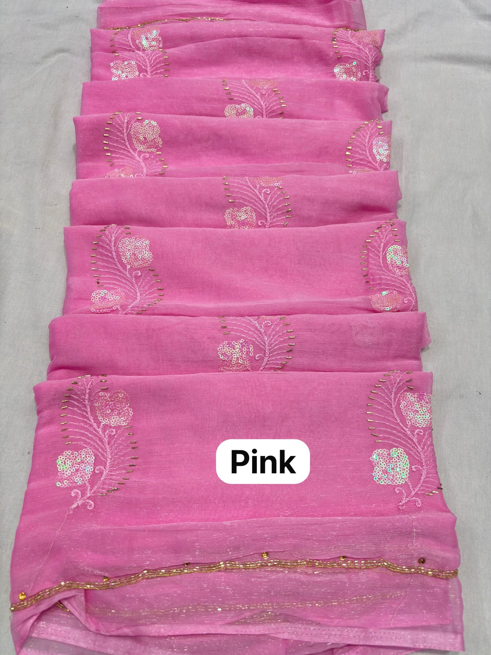 Elegant and effortlessly graceful — this Simar Chiffon Saree is all about timeless charm. Crafted in soft chiffon, it features intricate Kardana and hand Resham work, with delicate Chhadi butta designs that add a traditional yet trendy touch. The fresh fancy colour tones make it perfect for festive wear, small functions, or when you want to keep it simple yet stylish. Paired with a same fabric running blouse, this saree is ready to make you shine.